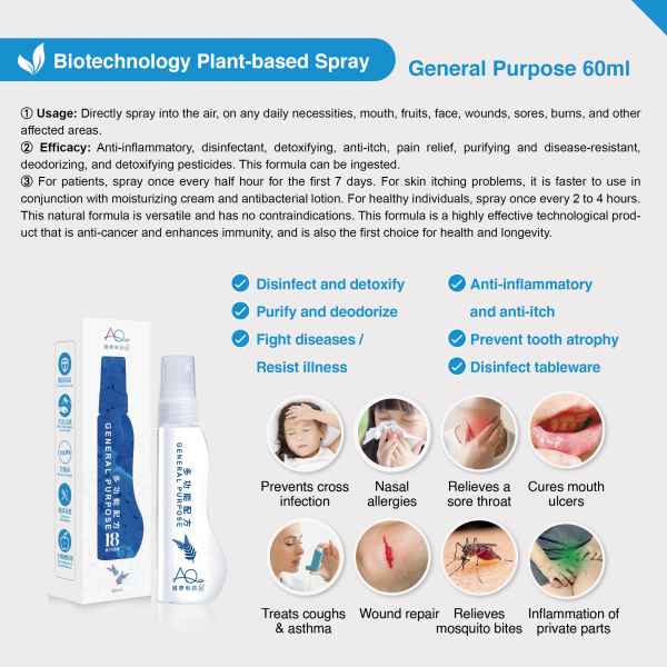 AQ Healthy Plant-based Spray contains more than a dozen plant components. The majority of these components are acquired from wild plants deep in the mountains. The biological agents are produced after 18 months of extraction and fermentation. It is a modern, revolutionary and environmentally friendly product developed in a bid to treat all types of subhealth and skin issues arising from the biggest enemy of humans—bacteria, viruses, and pollutants. Besides being perfectly safe to use orally, it has a delicately precise chain structure that is hard to be decoded by bacteria and viruses. AQ is a daily high-tech essential that protects the health of all households.